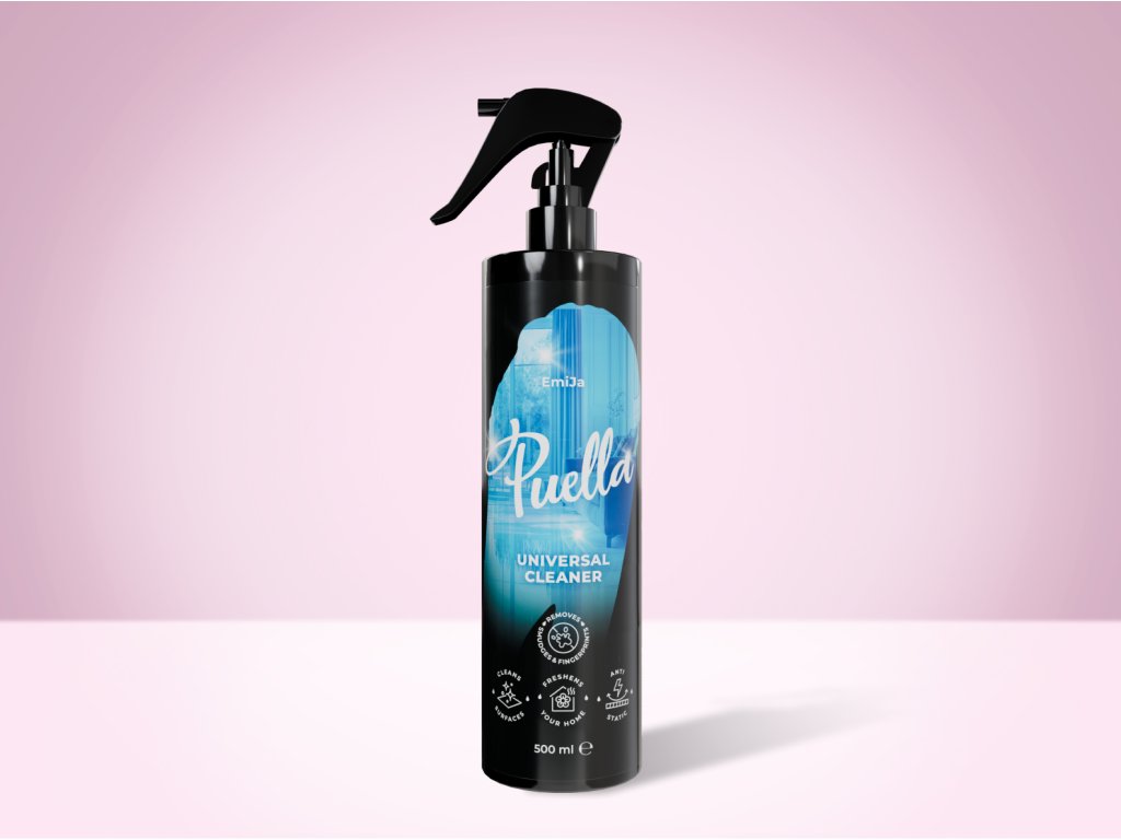 Puella univerzális tisztítóspray EmiJa illattal és kiegyensúlyozott pH-val. Gyengéden, mégis hatékonyan tisztítja a felületeket, eltávolítja a port, a maszatokat és az ujjlenyomatokat.