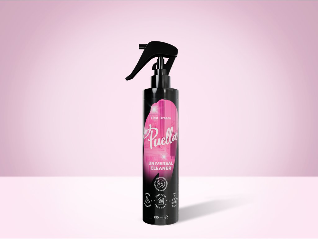 Puella univerzális tisztítóspray First Dream illattal és kiegyensúlyozott pH-val. Gyengéden, mégis hatékonyan tisztítja a felületeket, eltávolítja a port, a maszatokat és az ujjlenyomatokat.