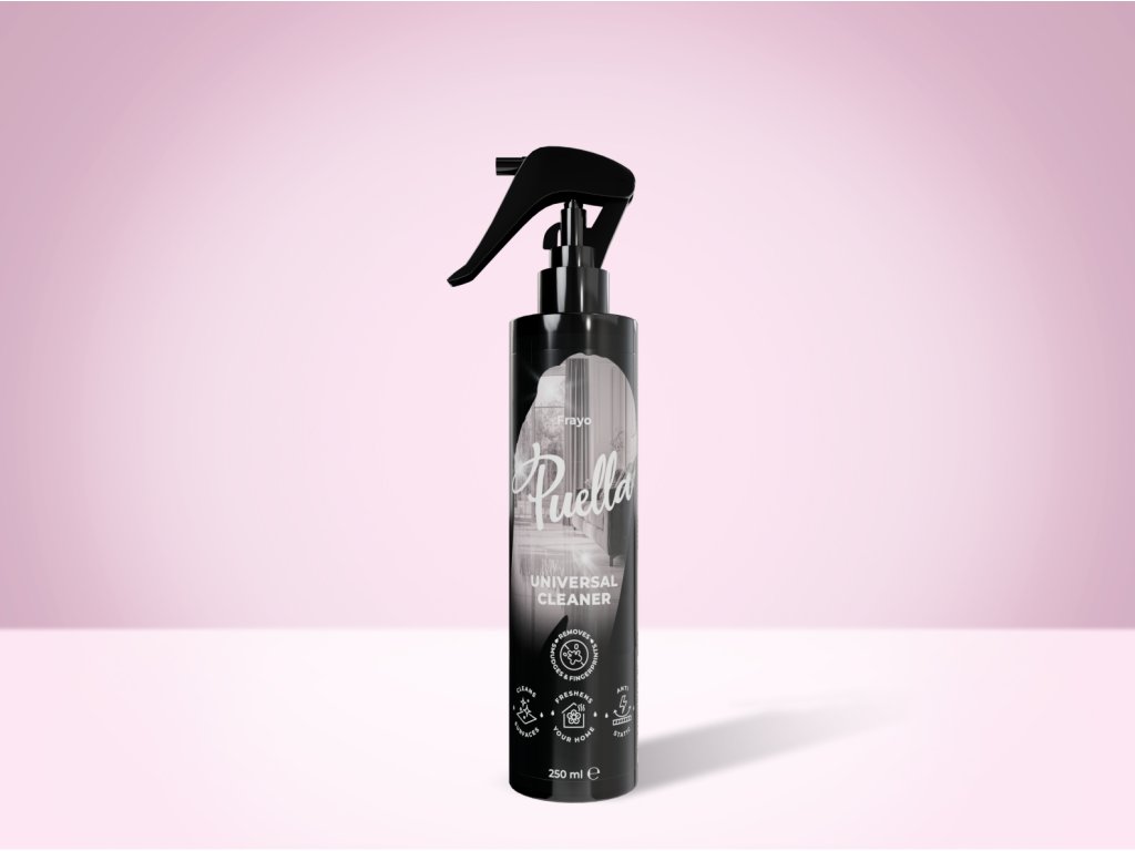 Puella univerzális tisztítóspray Frayo illattal és kiegyensúlyozott pH-val. Gyengéden, mégis hatékonyan tisztítja a felületeket, eltávolítja a port, a maszatokat és az ujjlenyomatokat.