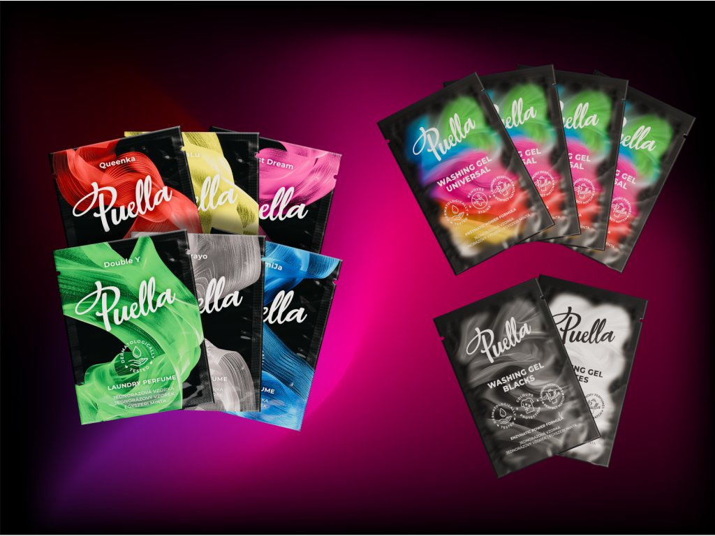 A Puella próbacsomag 6× mosóparfümöt, 4× univerzális mosógélt, 1× mosógélt fehér ruhákhoz és 1× mosógélt fekete ruhákhoz tartalmaz.