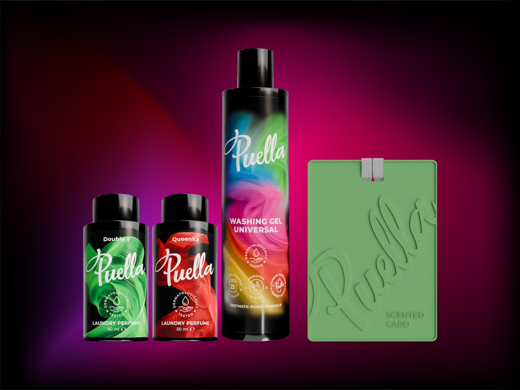 Tartalom: 2 db Puella mosóparfüm 50 ml, Puella mosógél 250 ml, Puella illatosító kártya